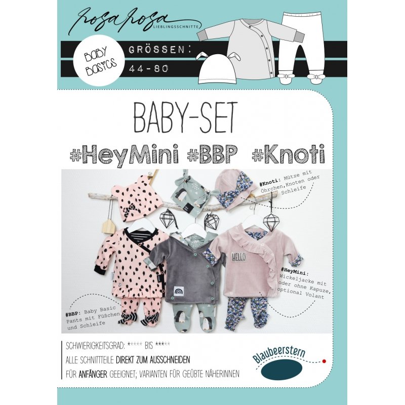 Papierschnittmuster Blaubeerstern Rosarosa Baby Set Hey Mini Pants Wickeljacke Knotenmutze Madchen Jungs